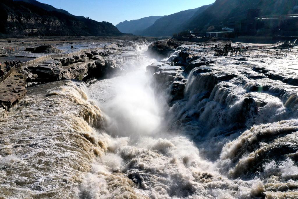 壶口瀑布是黄河流域的一大奇观。据当地水文部门介绍,黄河壶口段目前正处于枯水期,水流量约为500立方米/秒。受冷空气影响,12月14日8时,黄河壶口段首次出现流凌,较去年偏晚11天。该河段流凌部分由上游河道输送而来,部分由该河段本身产生,通常只流凌不封冻,一般于每年的11月下旬或12月初出现流凌,次年2月中下旬消失。