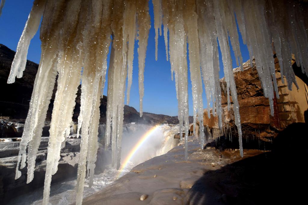 12月14日,黄河壶口瀑布出现冰挂美景。(吕桂明 摄)