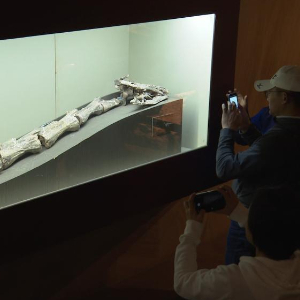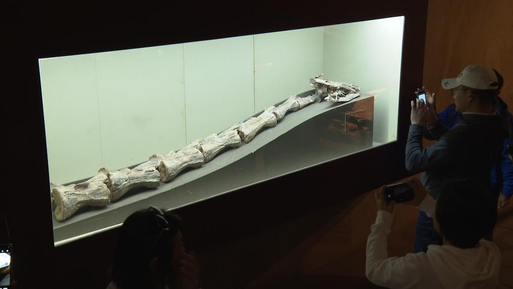游客正在禄丰恐龙谷大遗址馆内参观王氏栗树龙化石标本。(受访单位供图)
