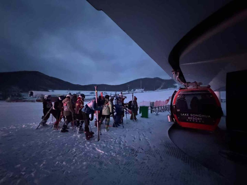 12月2日,在吉林万科松花湖滑雪度假区,中日两国滑雪少年一同等待乘坐缆车。受访者供图