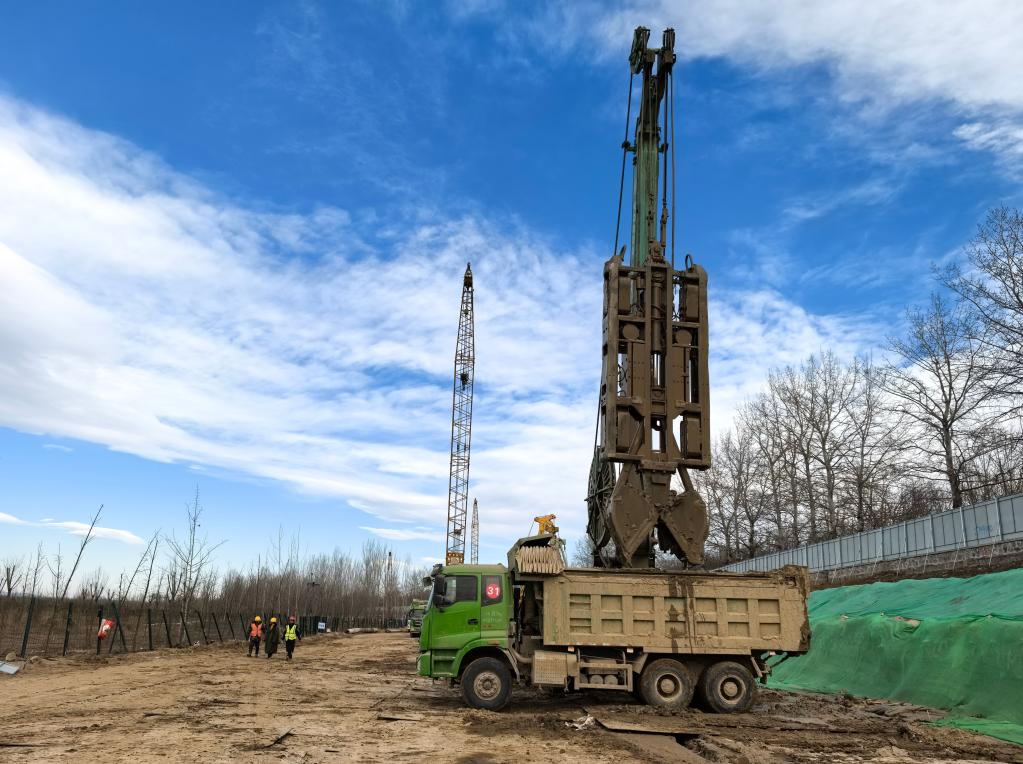 图为永定河卢梁段综合提升工程三标地下防冲墙建设,施工人员正在进行成槽清底。新华社记者刘诗平 摄