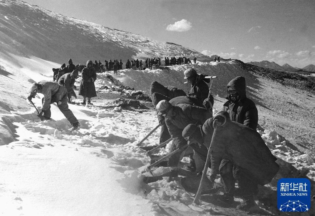 1952年,筑路民工在甲皮拉山顶铲除冰雪,让汽车通过。新华社记者 赵慎应 摄