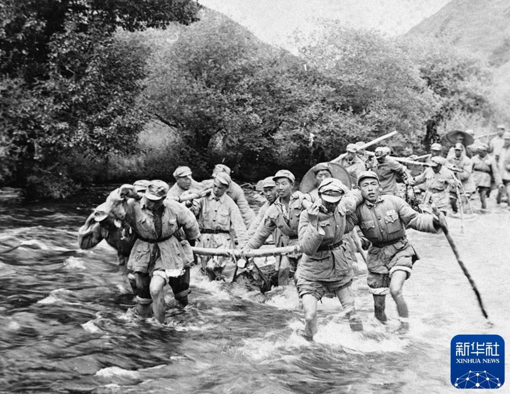 1950年,筑路大军挺进西藏途中,官兵们在冰冷刺骨的河水中抬运石料。新华社发