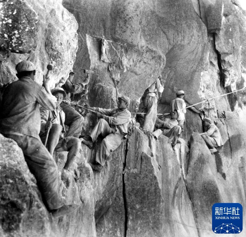 这是筑路战士在悬崖绝壁上修建川藏公路。新华社发