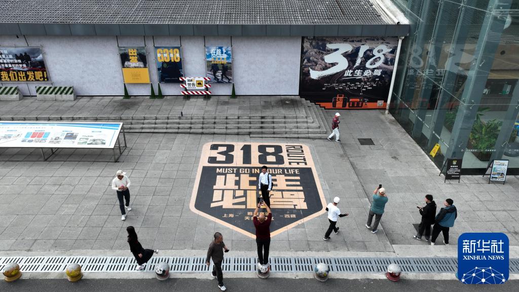 2024年10月27日,游客在雅康高速天全服务区地标图案前拍照(无人机照片)。新华社记者 胥冰洁 摄