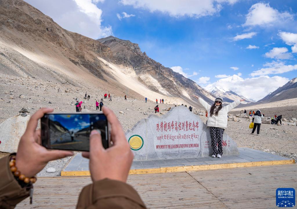 2024年5月24日,游客在珠穆朗玛峰高程测量纪念碑前拍照留念。新华社记者 孙非 摄