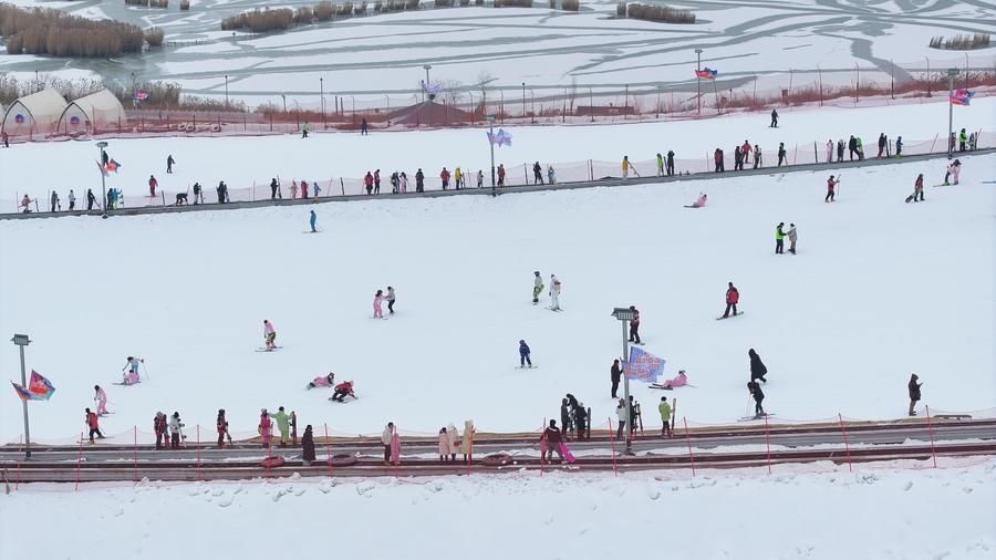 ↑2024年12月22日,游客在银川市阅海滑雪场滑雪(无人机照片)。