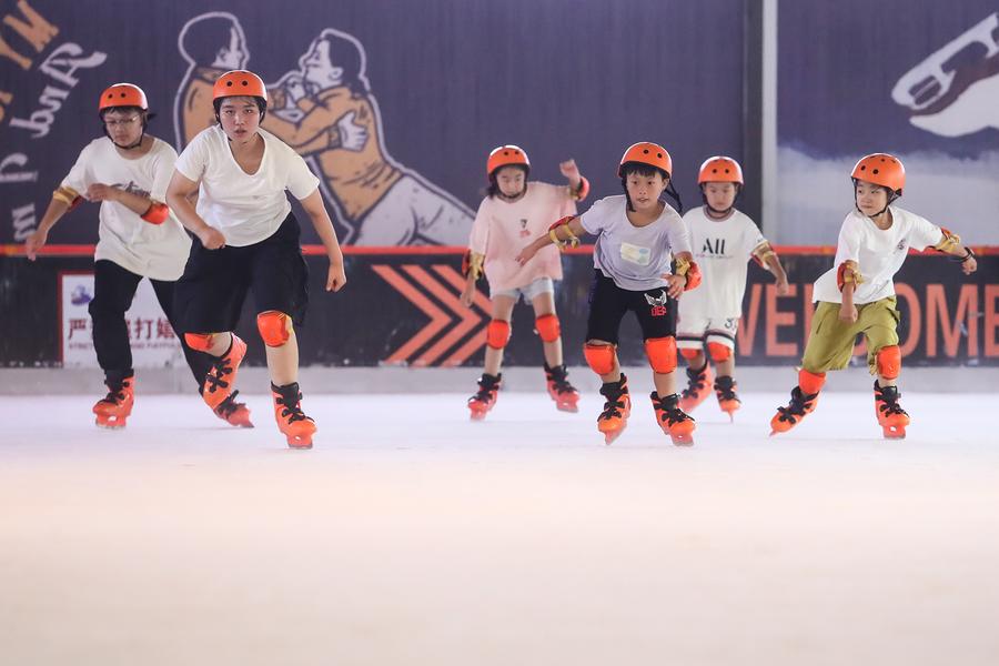 ↑2024年8月3日,在河南省商丘市城乡一体化示范区极地冰川室内滑冰场,孩子们在滑冰。