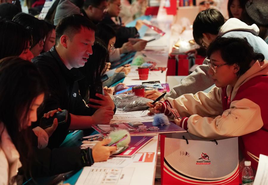 ↑2024年12月7日,观众在首都体育馆购买中国短道速滑国家队官方收藏卡。冰雪赛事让冰雪流量转化为持续增长的市场价值,拉动周边消费。