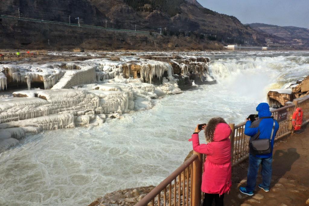游客在黄河壶口瀑布欣赏“冰瀑”美景。新华社发(吕桂明 摄)
