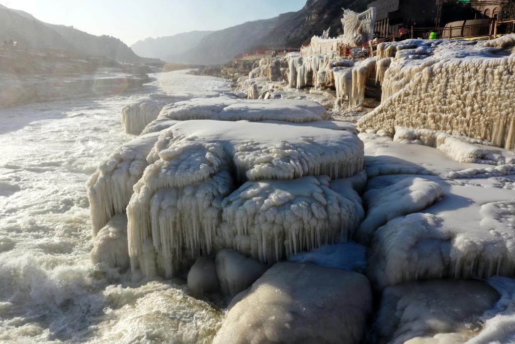 据当地水文部门介绍,黄河壶口段目前正处于枯水期,水流量约为300立方米/秒,受冷空气影响,目前当地最低气温在零下7摄氏度左右。因天气寒冷,瀑布水流和岩石碰撞后堆积凝结,形成“冰瀑”景观,有的如瀑布般倾泻而下,有的如钟乳石般悬挂在崖壁上,形态各异,美不胜收。