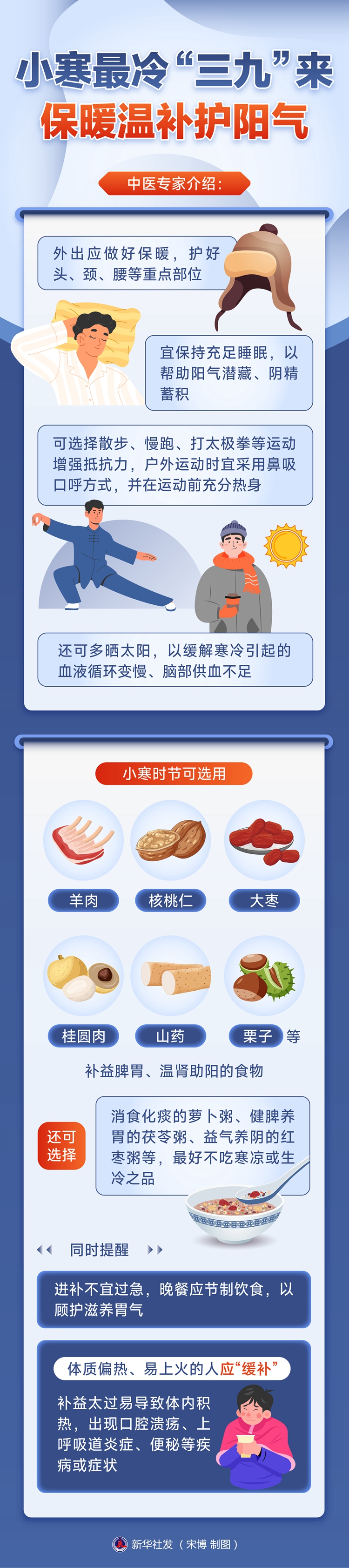 “因此,小寒养生不但要遵循‘秋冬养阴’的原则,还要格外注意保护阳气。”唐旭东说,外出应做好保暖,护好头、颈、腰等重点部位;宜保持充足睡眠,以帮助阳气潜藏、阴精蓄积;可选择散步、慢跑、打太极拳等运动增强抵抗力,户外运动时宜采用鼻吸口呼方式,并在运动前充分热身;还可多晒太阳,以缓解寒冷引起的血液循环变慢、脑部供血不足。