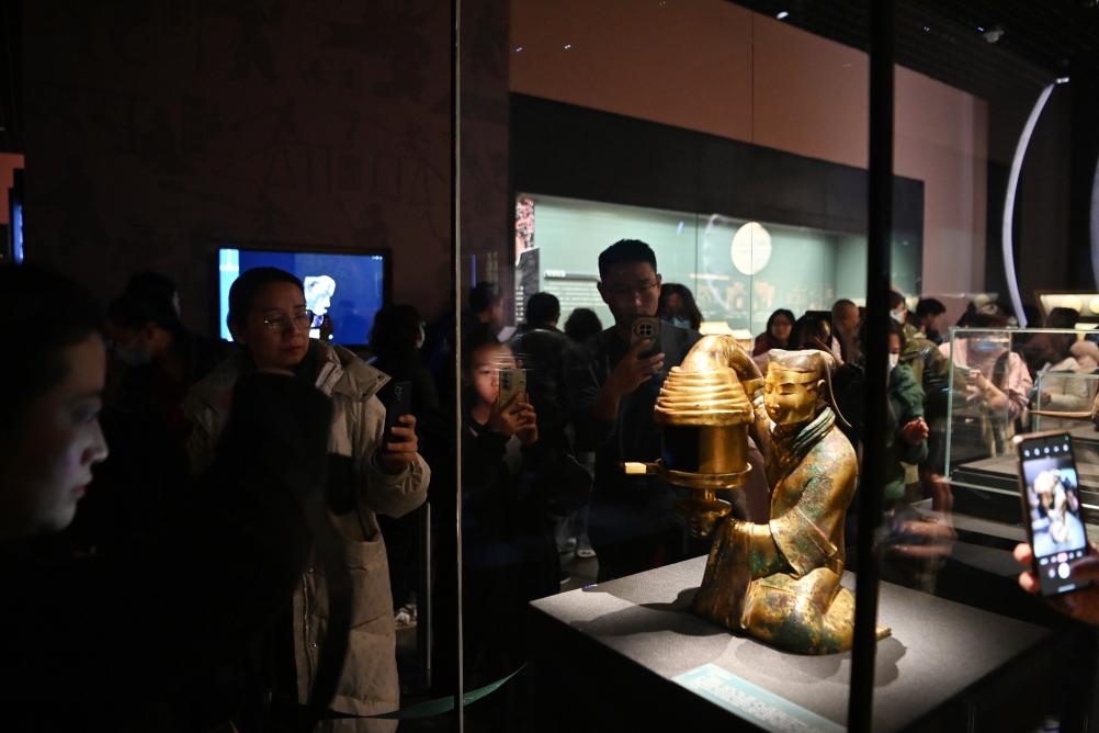 近日,在天津博物馆举行的“天开一统——秦汉文物主题展”上,包括长信宫灯在内的近400件(套)秦汉文物集中亮相,吸引观众前来参观。
