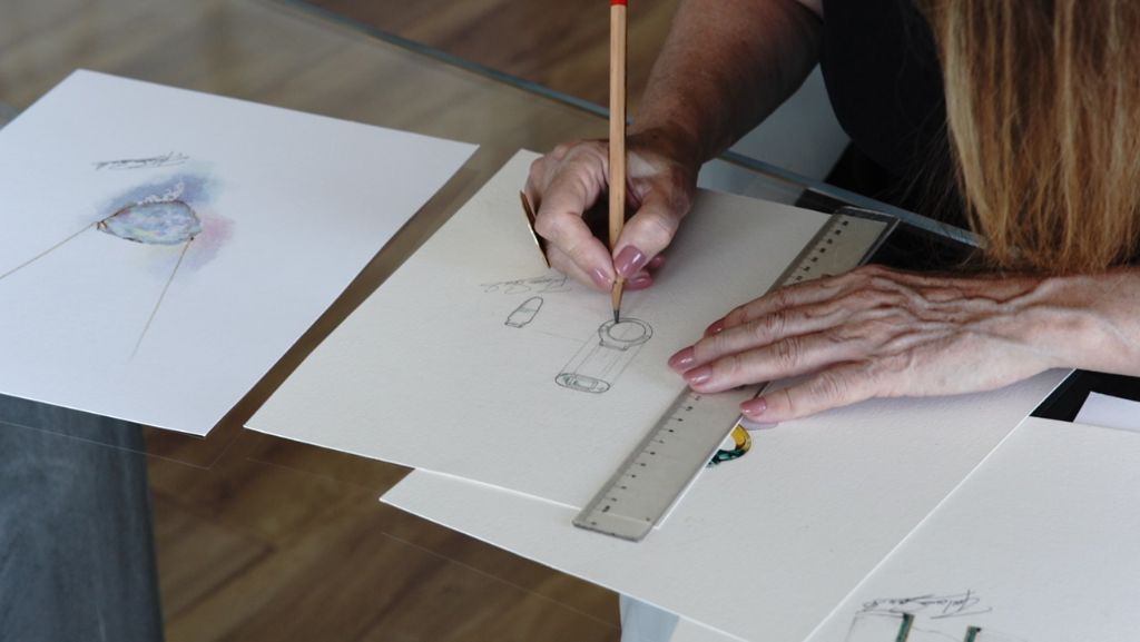 西班牙珠宝设计师帕洛玛·桑切斯在工作室中绘制设计图纸。(杨京丽摄)