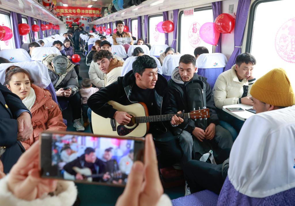 悠扬的琴声引起其他旅客的注意。得知还有人擅长弹琴,米尔阿迪力热情地递上自己的吉他,好几个手痒的旅客轮番献艺,听到柔情的民谣,不少人跟着哼唱起来。午后的阳光透进车窗,窗户上的“福”字映在旅客们的脸上。