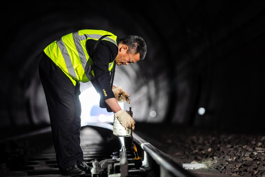 诸葛城站车站值班员李燕林在给道岔涂刷润滑油(1月21日摄)。