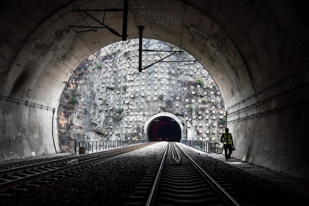 诸葛城站车站值班员李燕林在隧道里进行清扫道岔作业(1月21日摄)。