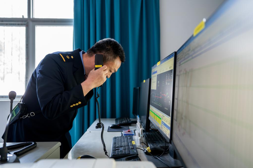 诸葛城站车站值班员李燕林正在与列车调度员联系工作(1月20日摄)。