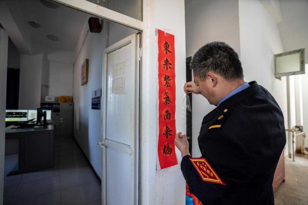 诸葛城站车站值班员李燕林在行车室门口贴春联(1月21日摄)。