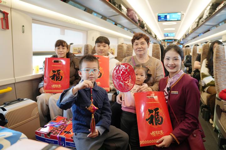 “各位旅客大家好,今天是农历小年,祝大家吉祥如意、福气满满。”列车长谭艳妮给乘车旅客送上祝福,并送上装有春联和福字的福袋,让福伴旅途。