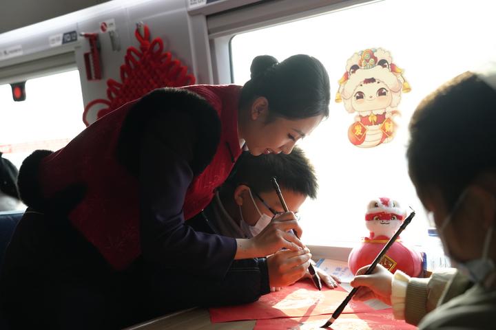为了让乘客体验更美好,中国铁路南宁局集团有限公司南宁客运段在G422次列车上开展“知年俗、寻年味”主题列车活动,列车工作人员同乘客一起贴窗花、送对联,尽享复兴号列车上移动的年味儿。