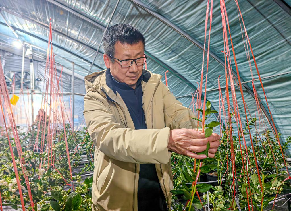 2025年1月17日,吉林省靖宇县靖宇镇河南村新时农家庭农场的温室大棚里,农场负责人焦明艳正在查看蓝莓生长情况。新华社记者 王帆 摄