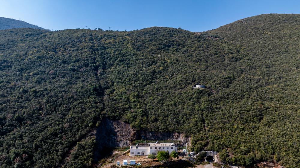 空中俯瞰位于大山中的诸葛城站站房。车站股道建在站房后的“山肚子”里(无人机照片,1月21日摄)。新华社记者胡超 摄
