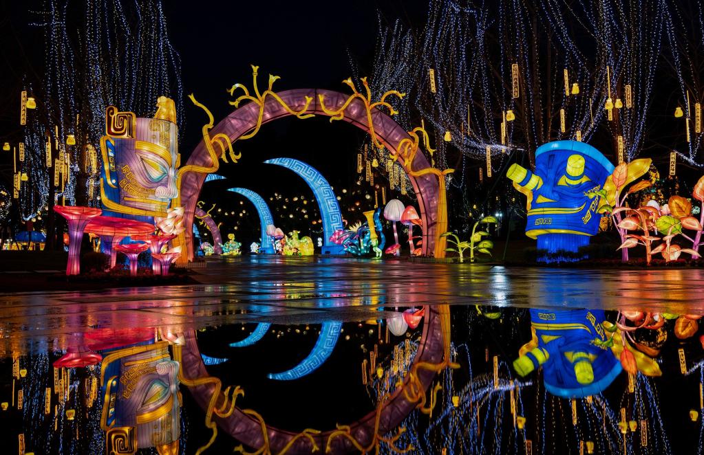 室内是静态的古代文明遗珍,室外是流光溢彩的彩灯。独特的文化体验延伸到广阔的考古遗址公园园区,一条以彩灯艺术打造的“文明长卷”在遗址公园的主干道上徐徐展开,太阳神鸟、古蜀祭坛、三星堆青铜面具、帕特农神庙等文化遗产,被打造成五光十色的花灯,让游客在“移步换景”中领略不同文明的璀璨历史。