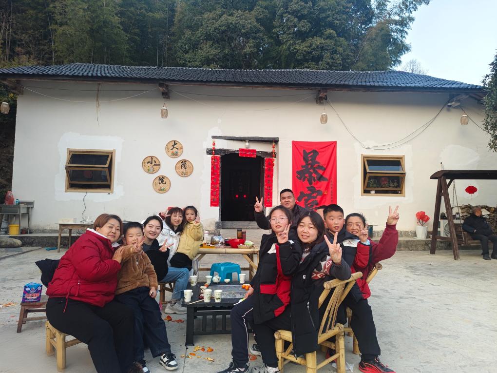 在安徽省岳西县河图镇明堂村,家家户户挂起红灯笼,贴上喜庆的春联。村民余新华家的大简小院农家乐已开门迎客,来自湖北武汉的杜洪川一家是农家乐春节的第一波客人,他们在这正享受着围炉煮茶的惬意。