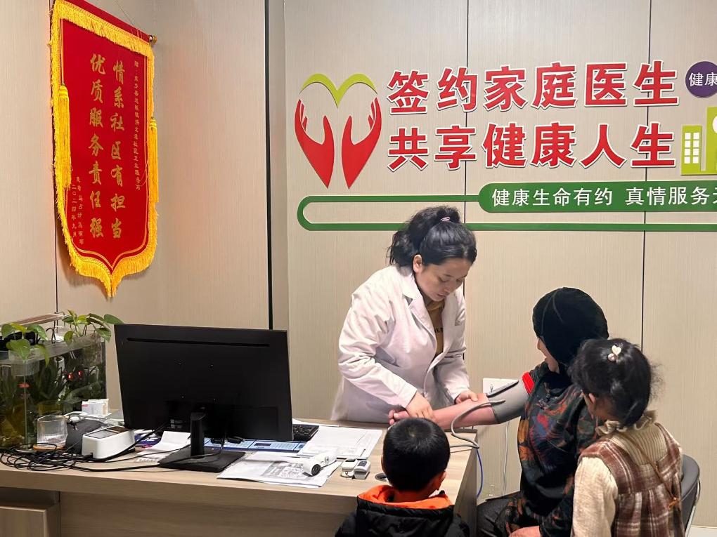 屋外零星响起爆竹声,卫生服务站里灯火仍亮。墙上一面新挂的锦旗,写着两行金色大字:情系社区有担当,优质服务责任强。