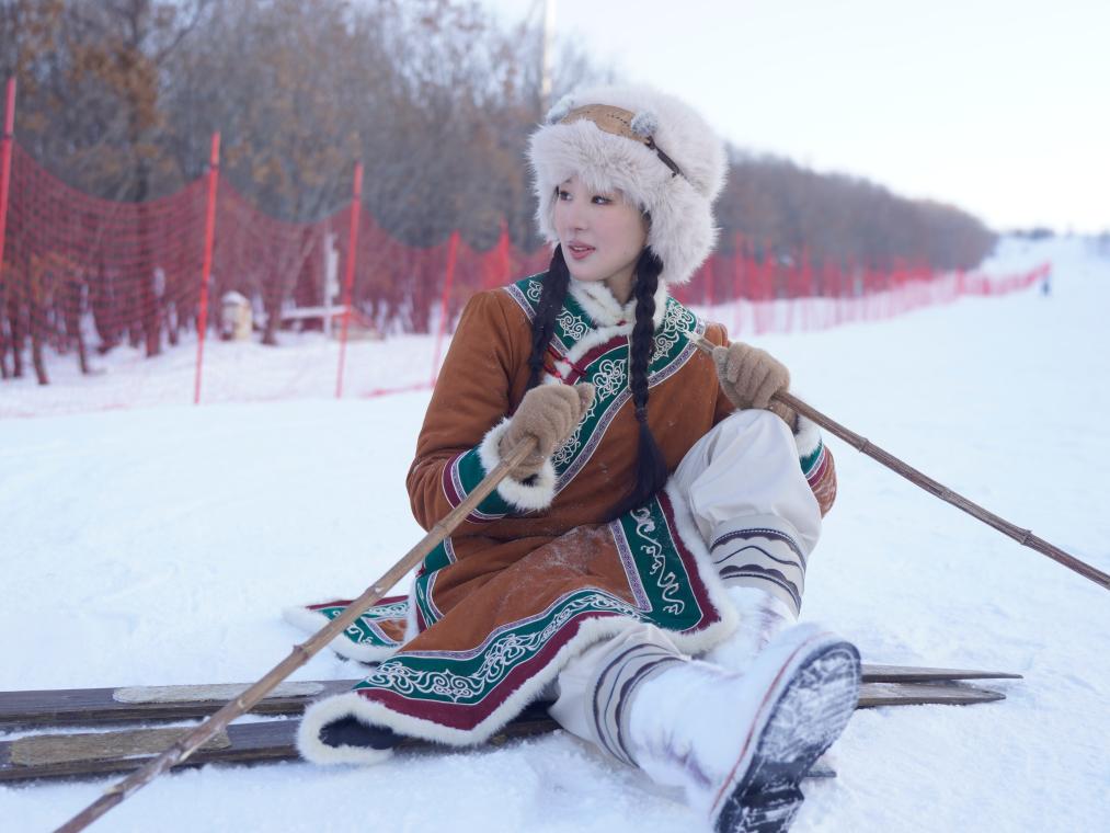 身着赫哲族传统服饰的滑雪爱好者在黑龙江省佳木斯市郊的敖其湾滑雪场滑雪。(受访者供图)