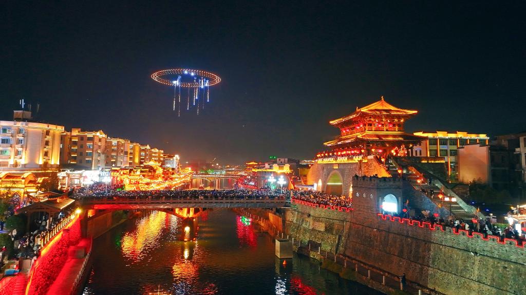 近千台无人机在古城门前缓缓升空,勾勒光彩绚烂的“时空之门”;古城墙上身着各个历史时期古装的表演队伍,从“古画”中鱼贯而出带领游客感受千年历史风华……大年初一晚上,位于闽西的国家历史文化名城长汀,用一场“科技+文化”盛宴引燃了小城假期文旅热潮。