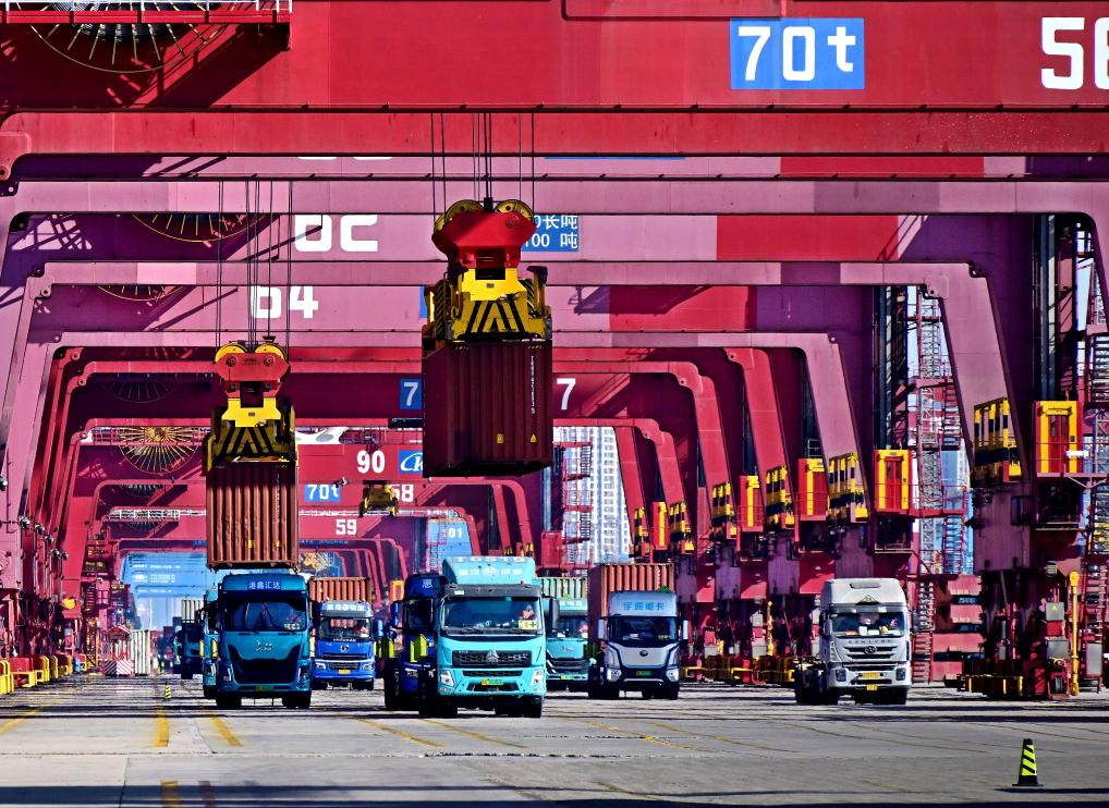 1月29日,卡车司机在山东港口青岛港前湾集装箱码头运送集装箱。新华社记者 李紫恒 摄