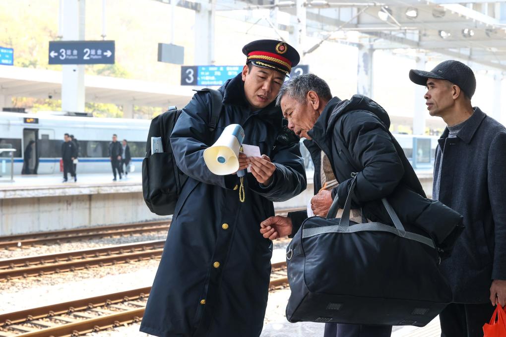 1月30日,国铁南昌局宁德站客运员张鹏昌在站台服务旅客。新华社发(王勇富 摄)
