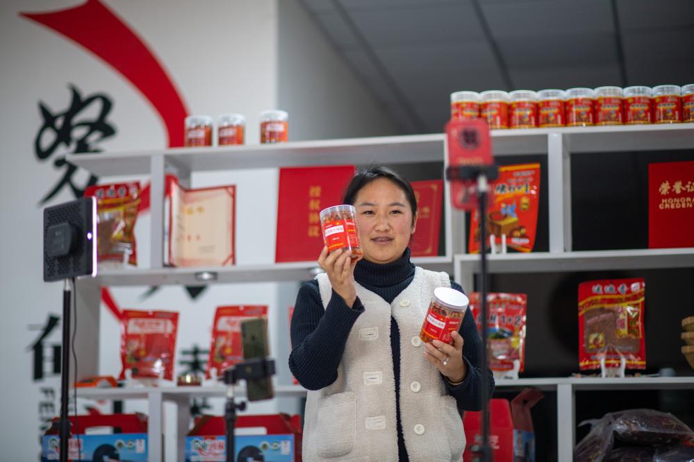 云南省曲靖市会泽县乐业镇村民黄国美在家门口的产业园区直播带货(1月22日摄)。新华社记者 江文耀 摄