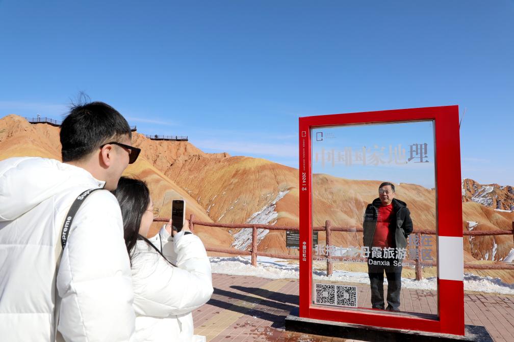 游客在雪后游览张掖七彩丹霞旅游景区。(张掖市临泽县委宣传部供图)