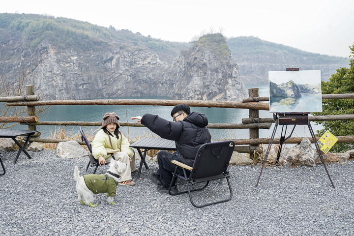 游客在安吉梅溪镇红庙村“深蓝计划”咖啡馆的矿坑边休闲赏景(2025年1月24日摄)。新华社发(潘学康摄)