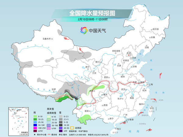 明天,内蒙古西部、甘肃西部、西藏东部、川西高原、云南西北部等地部分地区有小到中雪或雨夹雪,其中,西藏东南部等地部分地区有大到暴雪。西藏东南部、云南南部等地部分地区有小到中雨。