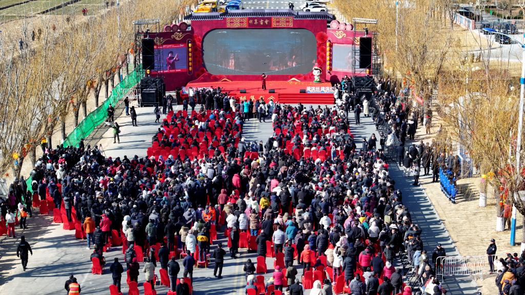 2月9日,观众在观看中国曲协“送欢笑到基层”走进惠民专场演出(无人机照片)。