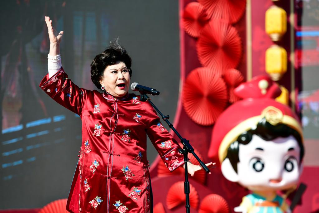 2月9日,河北省沧州市的曲艺艺人朱玉凤在胡集书会上表演西河大鼓《罗成算卦》。