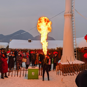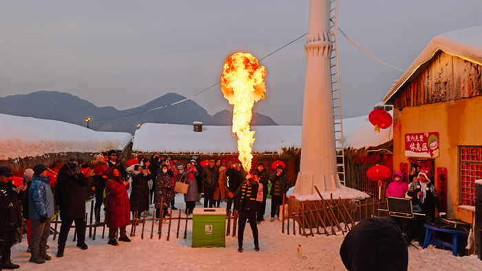驱车往西北半个小时,到达山里各庄,看到的是另一番景象。山里各庄正在举办土嗨冰雪节活动,驯鹿拉雪橇、魔术表演、雪地蹦迪、打铁花……锣鼓声、歌声、欢笑声交织在一起,构成了一幅生动的乡村年画。