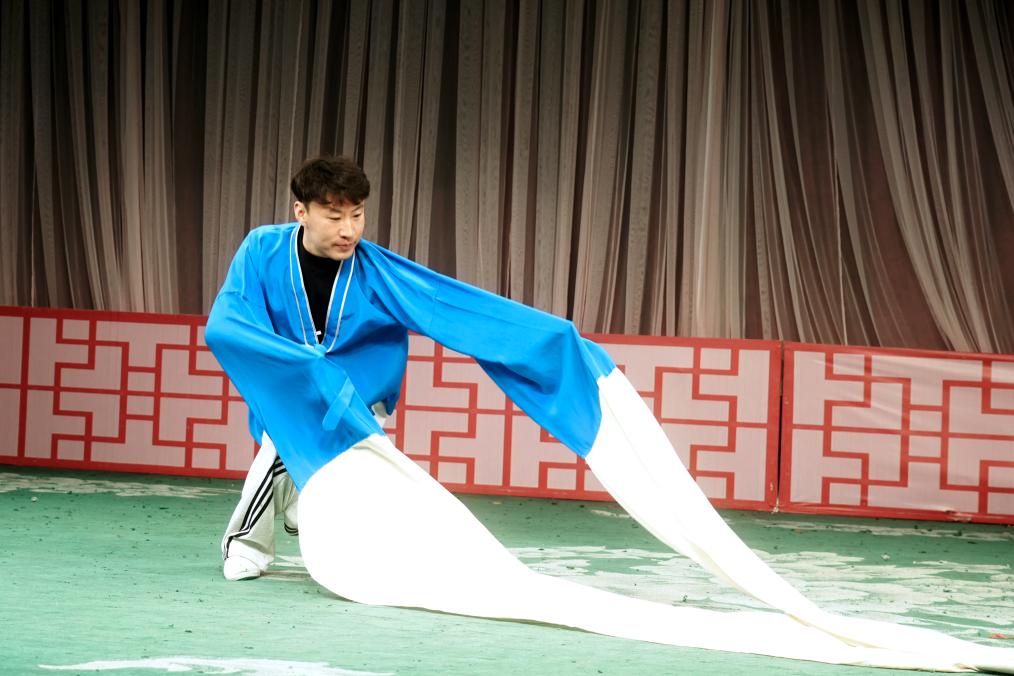 2月11日,在沾化区体育馆前的舞台上,几名演员正在表演渔鼓戏。新华社记者高天 摄