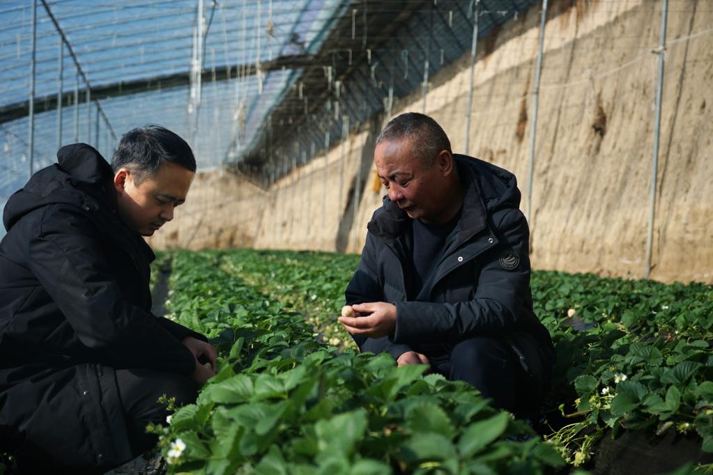 1月17日,张志伟(右)与杨世鹏交流草莓种植情况。新华社记者陈杰 摄