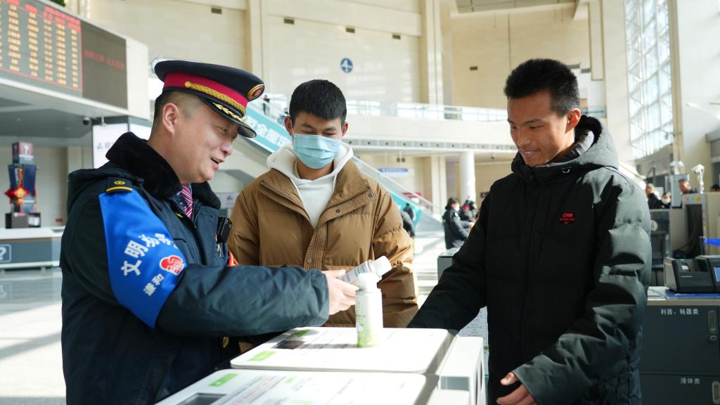 合肥站客运值班员为旅客讲解禁止携带物品相关规定。(朱扬 摄)