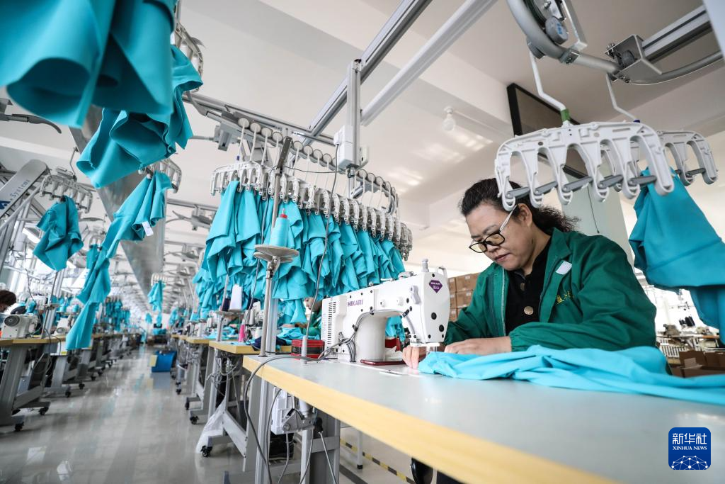 2019年3月6日,工人在葫芦岛益丰(集团)运动服饰有限公司生产车间加工泳衣。新华社记者 潘昱龙 摄