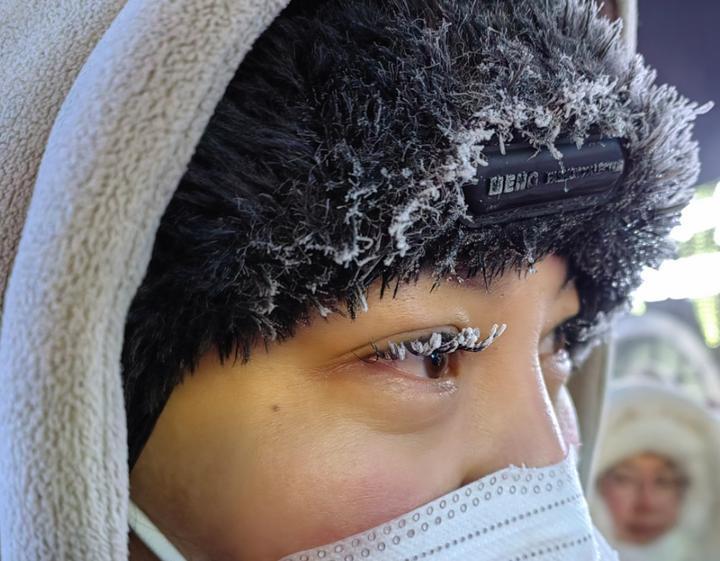 2月6日晚,睫毛上挂满冰霜的游客。 岳冉冉摄