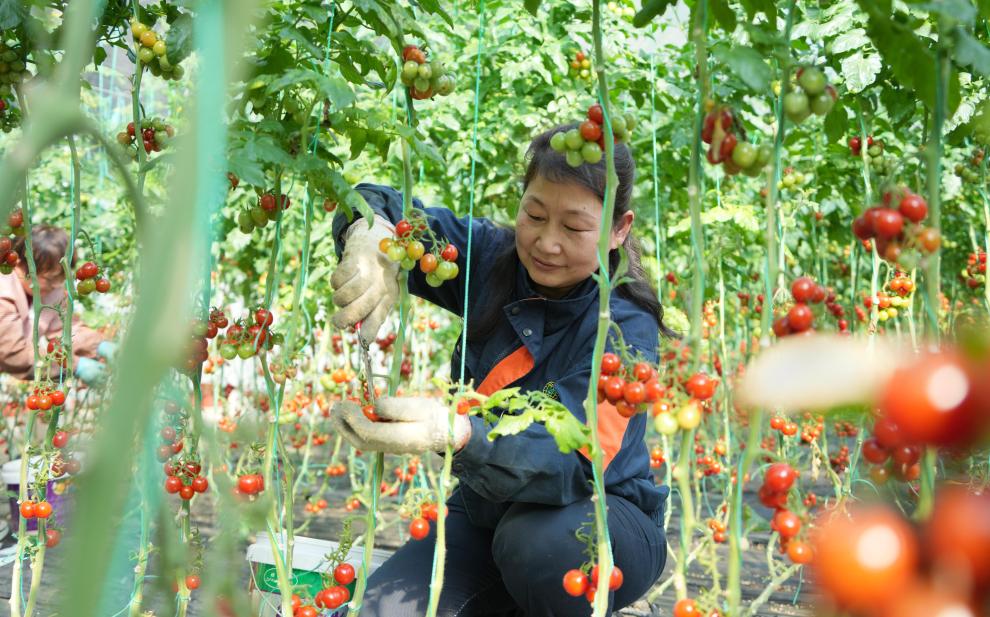 2月19日,在山东省潍坊市寒亭区前阙庄村,村民在收获西红柿。新华社记者 徐速绘 摄