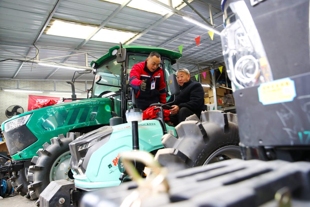 2月20日,重庆市黔江区普顺农机专业合作社技术员(左)给选购农机的村民介绍农机操作方法。近日,各地进入春耕时节,农民采购农用机械为春季农业生产做准备,农机市场迎来销售高峰。 新华社发(杨敏摄)
