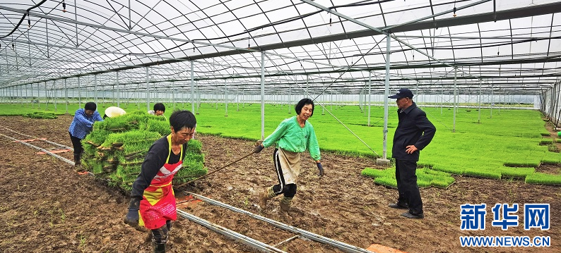 图为驼子村村民在育秧大棚运秧苗。新华网发 卢发明摄