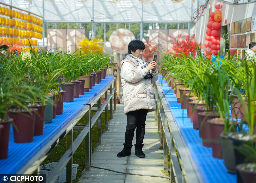 ↑2025年2月13日,兰花爱好者在浙江省湖州市长兴县龙山街道川步村兰花博览园举办的兰花展上赏花拍照。CICPHOTO/陈海伟 摄